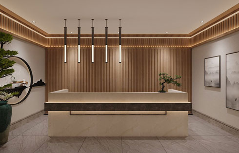 上海裝潢公司案例:與辦公室設(shè)計(jì)不同,此類空間用灰色石材與木色格柵遙相呼應(yīng),彌散出絲絲的東方意蘊(yùn),墻面著以燈光嵌入其間,宛如初春的金陵。