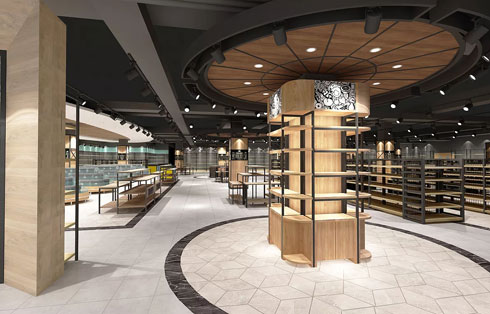 上海裝修公司案例:大空間設(shè)計(jì)將商品展示以精品室的陳列方式呈現(xiàn),利用中島式的試吃臺(tái)將動(dòng)線劃分開來(lái)。