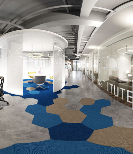 上海辦公室裝修公司案例:不同的材料和照明為每個(gè)層次和活動(dòng)帶來(lái)溫暖和個(gè)性。循環(huán)模式提供了各種移動(dòng)和居住空間的體驗(yàn)。